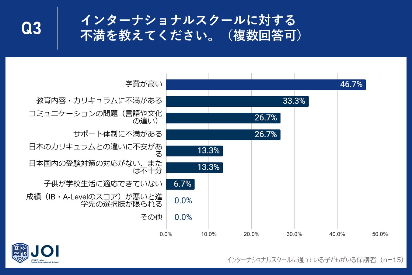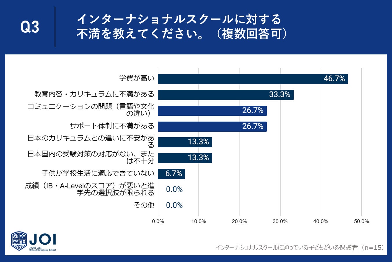 次に多かった不満は、「教育内容・カリキュラムに不満がある」というもので、インターナショナルスクールに不満を持つ保護者の33.3%がこれを挙げています。インターナショナルスクールでは、多様な教育プログラムが提供されていますが、保護者の期待に対して十分でないと感じる部分もあるようです。また、日本のカリキュラムとの違いに対する不安も13.3%の保護者から指摘されており、国内の教育システムとのギャップが家庭によっては問題視されています。