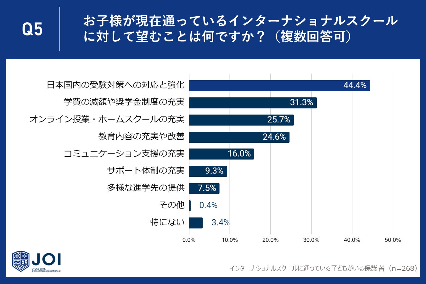最後に、インターナショナルスクールに対する要望としては、44.4%の保護者が「日本国内の受験対策の強化」を求めており、次いで31.3%が「学費の減額や奨学金制度の充実」を望んでいます。また、25.7%の保護者が「オンライン授業・ホームスクールの充実」を希望しており、柔軟な学習環境の提供を求めていることがわかりました。