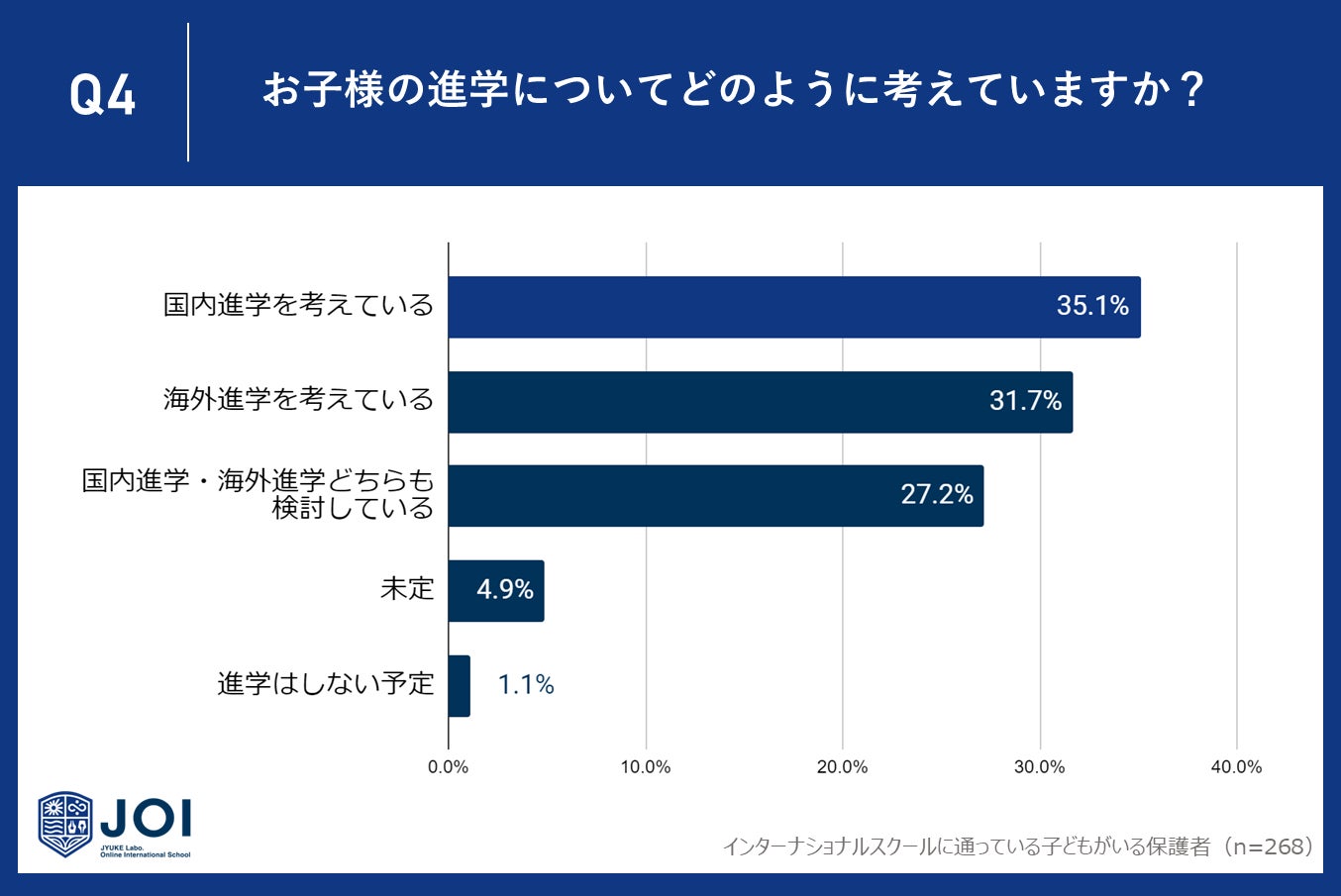 進学先の希望に関しては、35.1%の保護者が国内進学を考えており、次いで31.7%が海外進学を検討しています。また、27.2%の保護者は国内進学と海外進学の両方を視野に入れていることがわかりました。