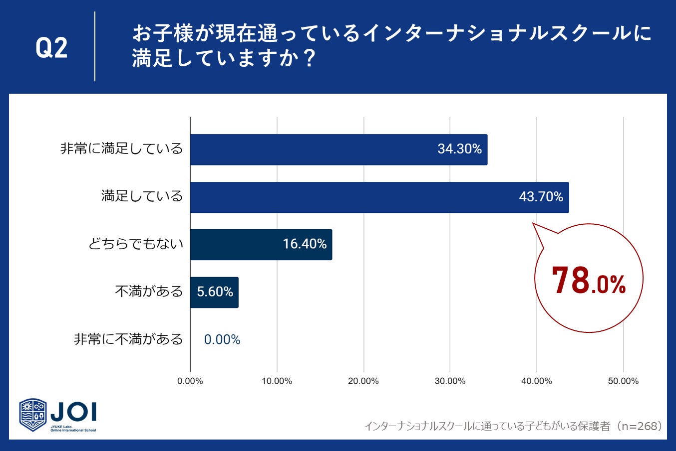 じゅけラボOnlineインターナショナルスクールJOI(所在地:大阪市北区、代表取締役:後藤智則)は、子どもを現在インターナショナルスクールに通わせている保護者268人に、インターナショナルスクールに子ども行かせる理由や満足度、そして希望する進路先やスクールに要望することなどアンケート調査を実施しました。