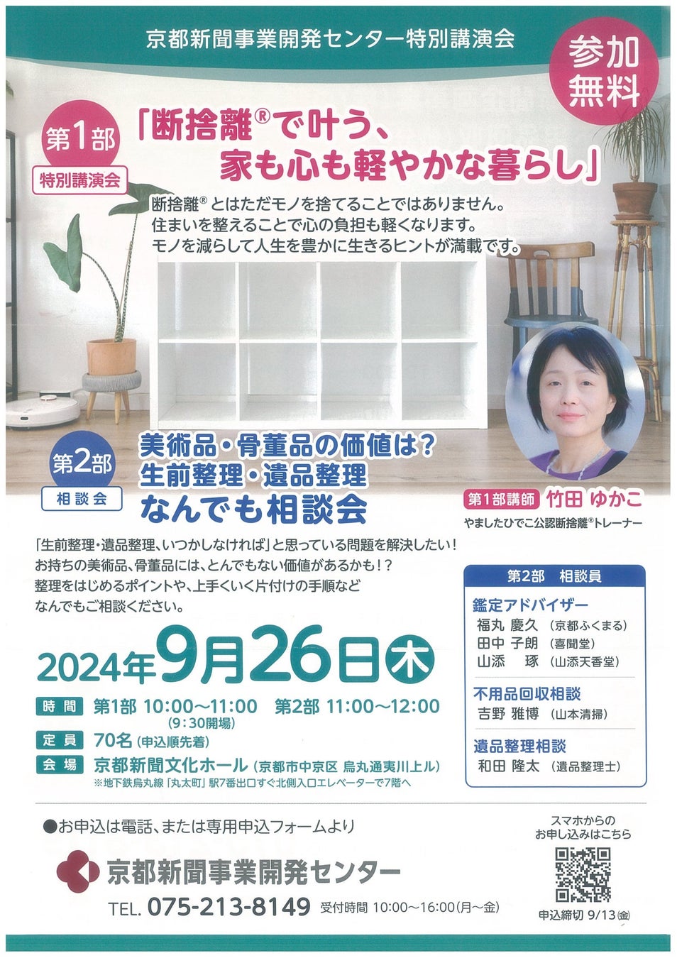 京都新聞事業開発センター特別講演会 <第1部>特別講演会「断捨離®で叶う、家も心も軽やかな暮らし」 <第2部>美術品・骨董品の価値は?生前整理・遺品整理 「なんでも相談会」
