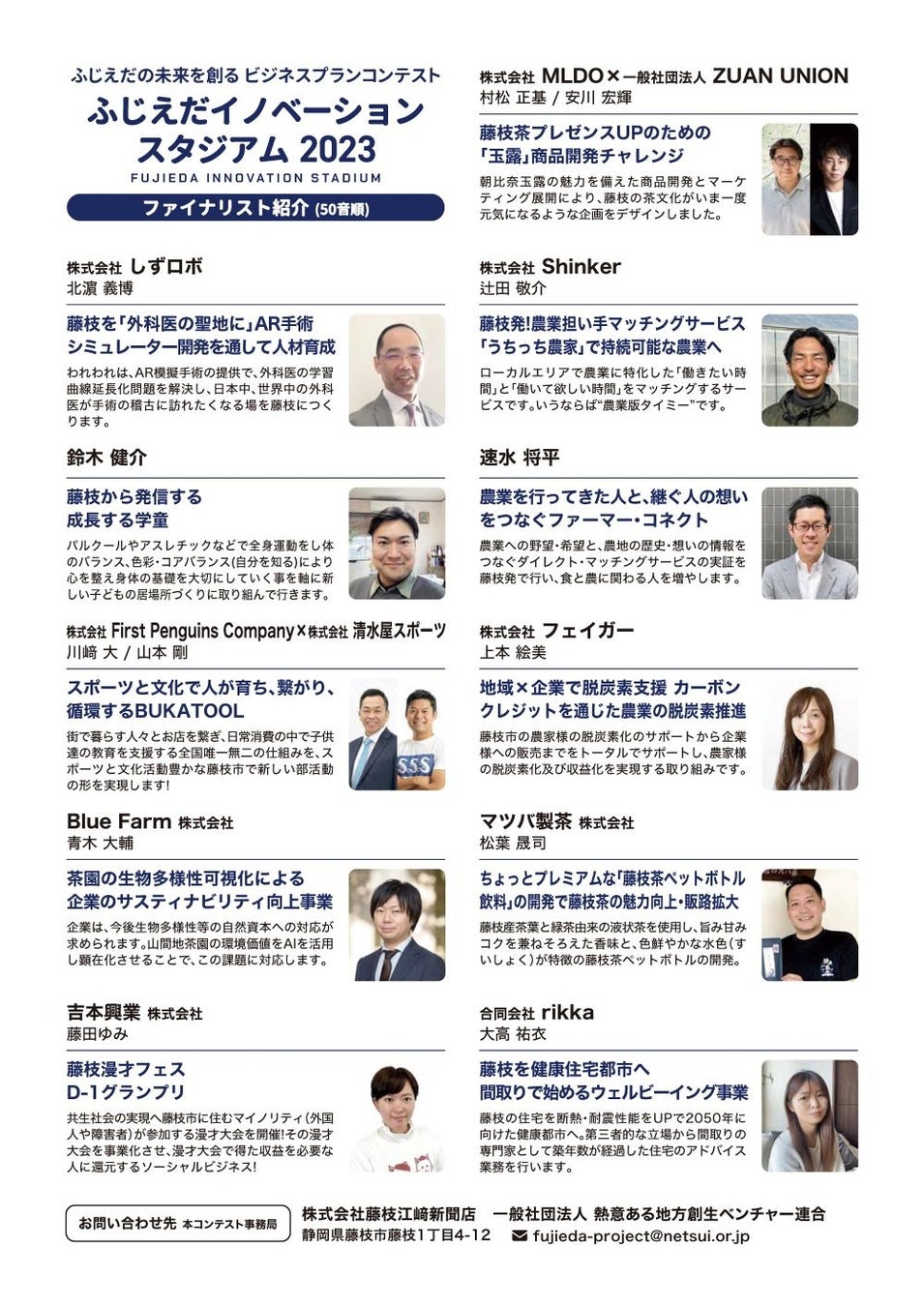 ・10月4日(水)に首都圏企業と市内企業を対象としたスタディツアー“フジエダ未来共創会議”を開催し、新たなビジネスのヒントを得た企業が当コンテストに挑戦しています。そのうち、5社がコンテストのファイナリストに選ばれています。