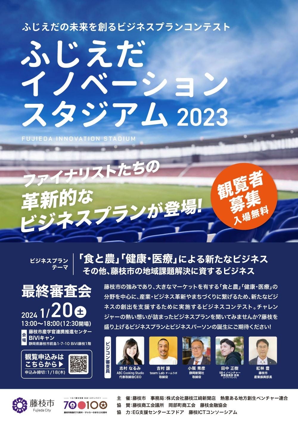 藤枝市の新たな成長戦略である「食と農×健康・医療」をテーマとした産業まちづくりに向け、首都圏のスタートアップや市内企業の参画を促すことを目的としたビジネスプランコンテスト「ふじえだイノベーションスタジアム2023」の最終審査会を開催します。