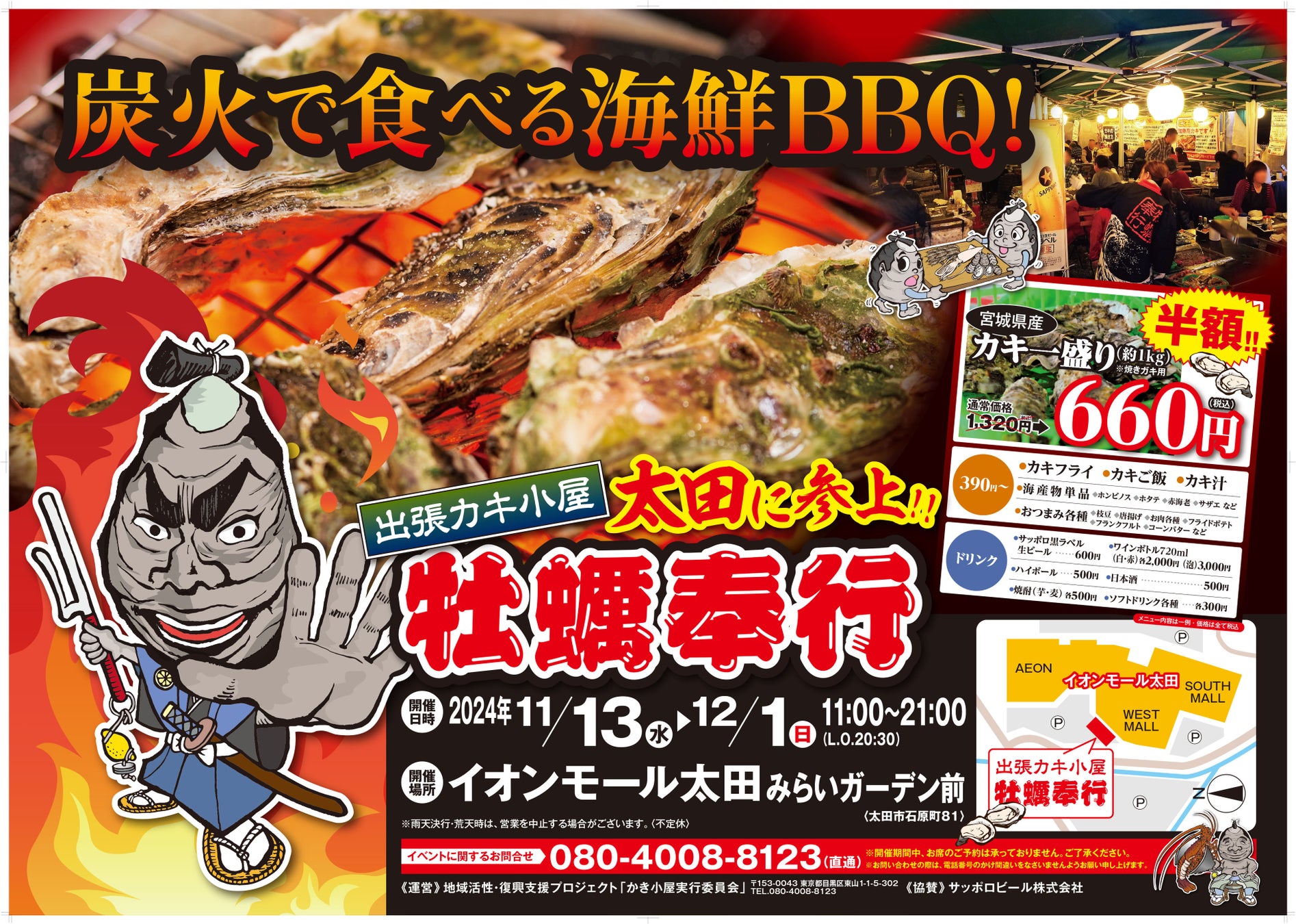 群馬県太田市 ▶︎東北の牡蠣が、復興支援価格の約1kg660円!! 11/13 - 12/1 の限定出店!炭火焼き出張カキ小屋「牡蠣奉行」