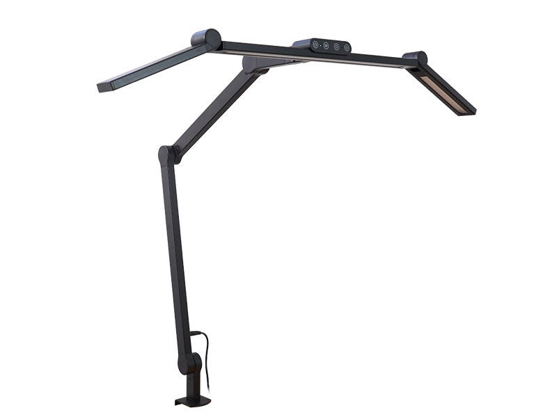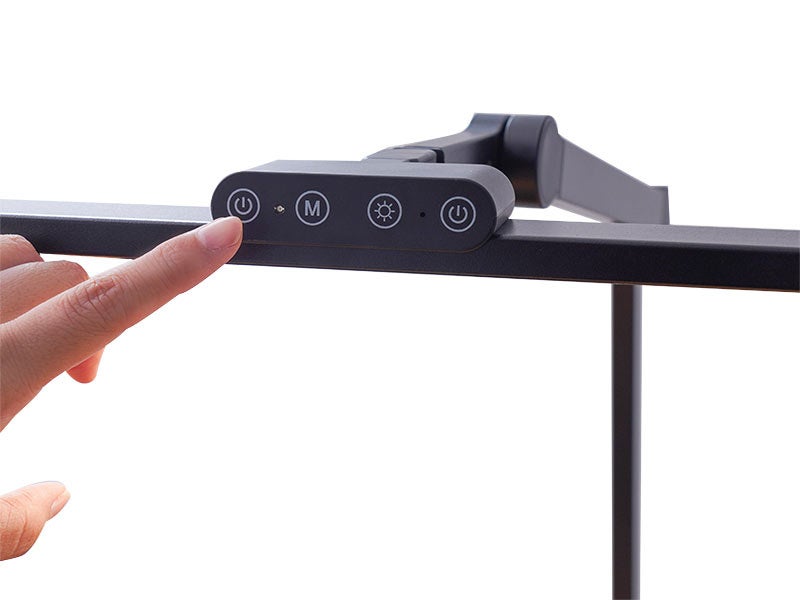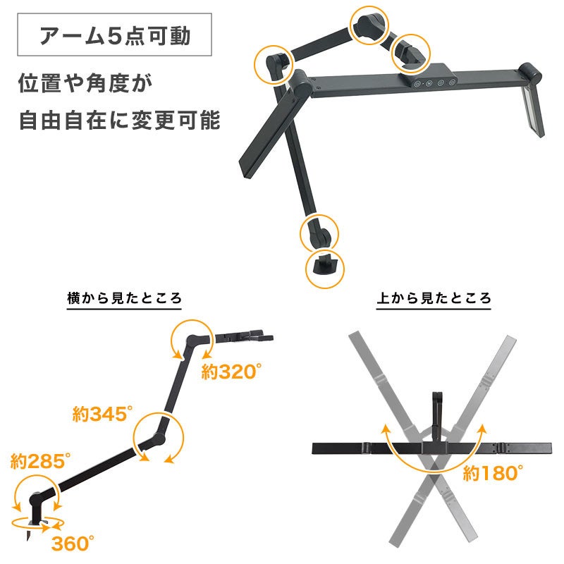 お手持ちの机に挟んで固定するクランプ式。天板の厚み1~6cm、出しろ4cm以上の机に取り付けできます。最大横72cm(中央部43cm、左右それぞれ14.5cm)。左右部分は回転させて横から照らしたり、上向きにLEDライトを向けることが可能。アーム部は3軸でそれぞれ上下に角度調整が可能でお好きな位置に固定できます。上部のタッチパネルでセンターLEDのオンオフ・明るさ調整(ワンタッチ5段階、長押し無段階)、左右(共通)のLEDオンオフ・明るさ調整(ワンタッチ5段階、長押し無段階)。3LED共通、温度(電球色~昼白色から昼光色)までワンタッチ5段階、無段階に切り替えが可能。