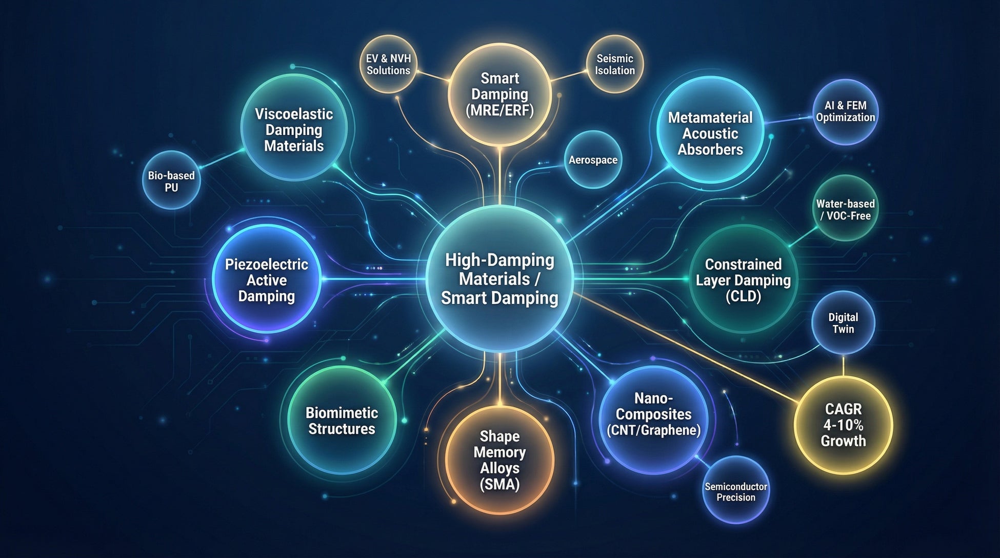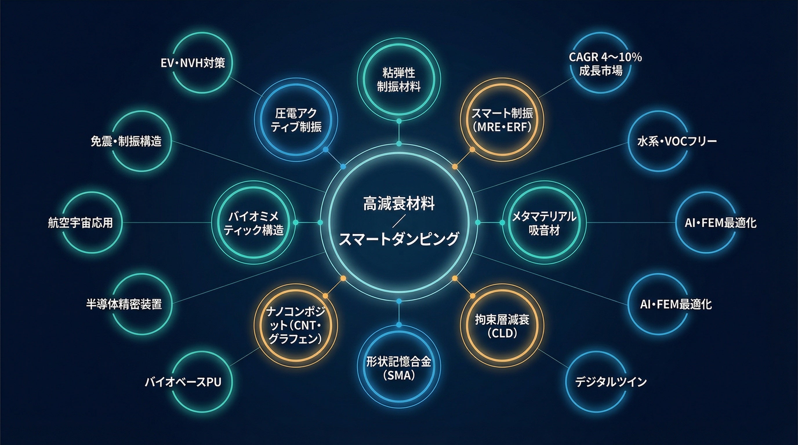 用途別実装ロードマップ(EV・建築・航空・半導体装置・風力)と事業ケースを参照し、CLD/VED/ACLD/MREの採用判断に直接役立てる