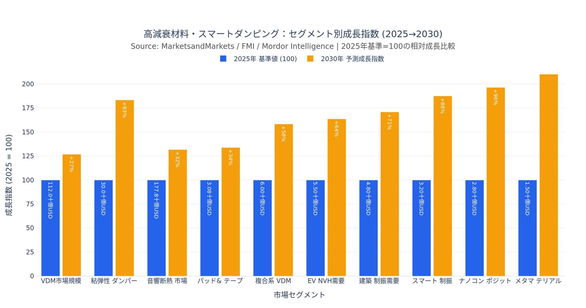 ● 振動減衰材料(VDM)のグローバル市場は2025年約1,120億USD から2030年約1,420億USD(CAGR約4.8%)へ拡大し、建築用粘弾性ダンパーに至っては2025年300億USD→2035年780億USD(CAGR約10%)という高成長軌道が予測されている。