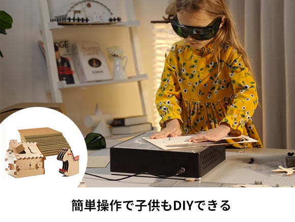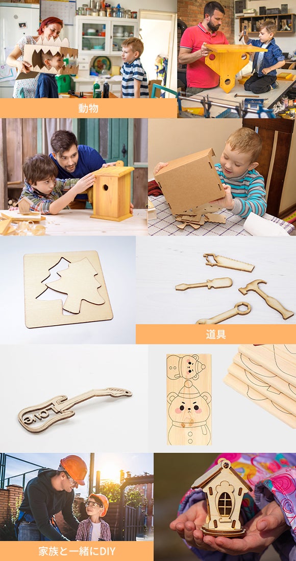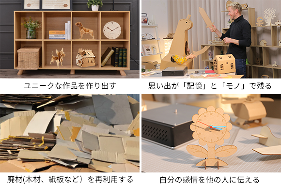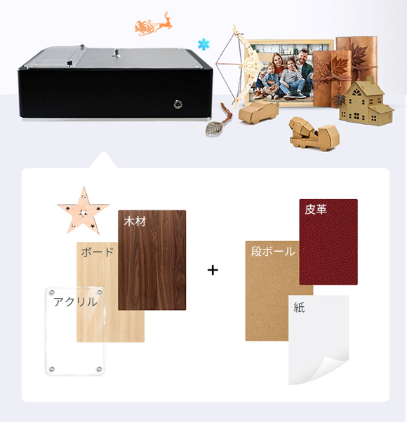 ①厚さ3mmまでの段ボール、木材、アクリル板、皮革を簡単に処理できる。