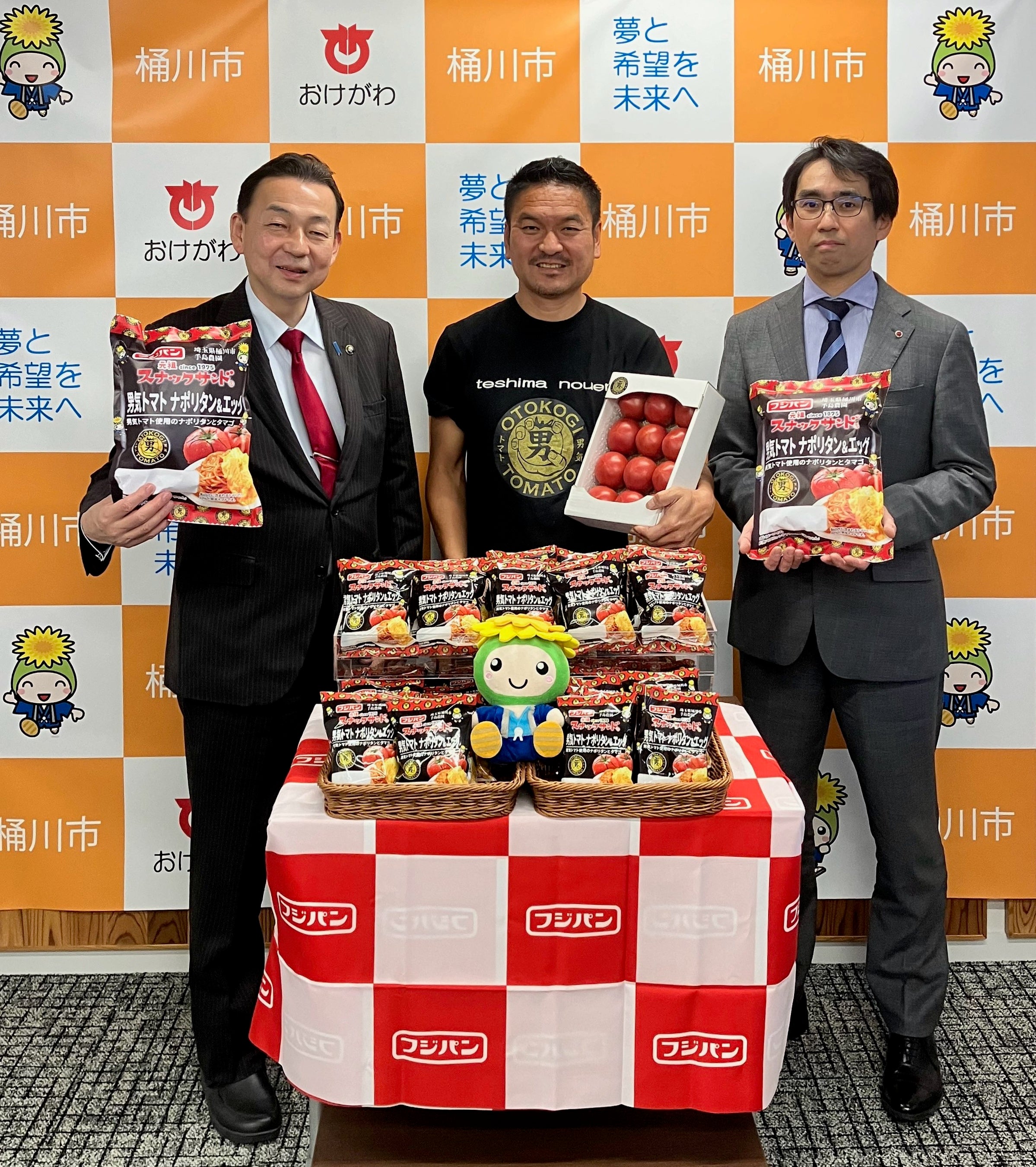 2024年4月25日(木)に埼玉県桶川市、小野克典市長を手島農園、手島孝明社長とともに表敬訪問いたしました。桶川市のマスコットキャラクターのオケちゃんをパッケージにデザインし、「スナックサンド 男気トマトナポリタン&エッグ」を通して桶川市の知名度アップや桶川産農産物の地産地消による地域貢献への想いをお伝えし、小野市長から激励をいただきました。