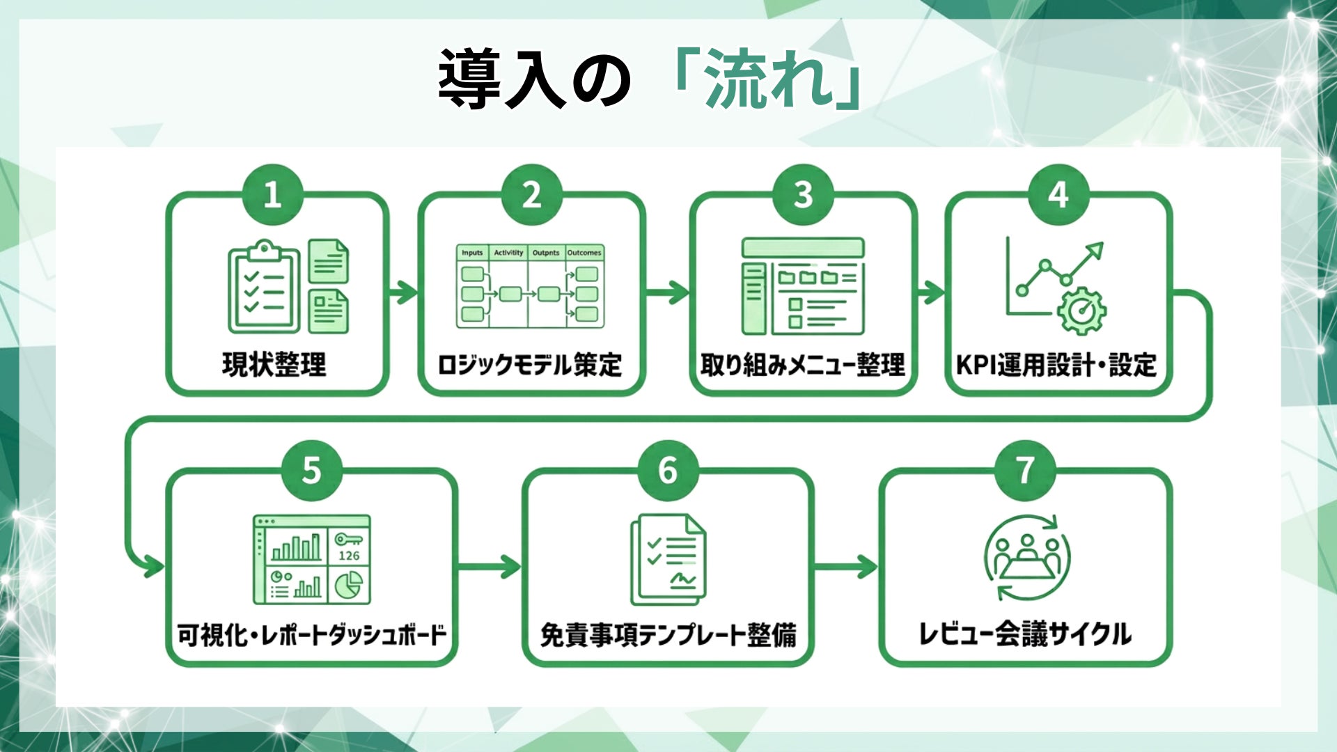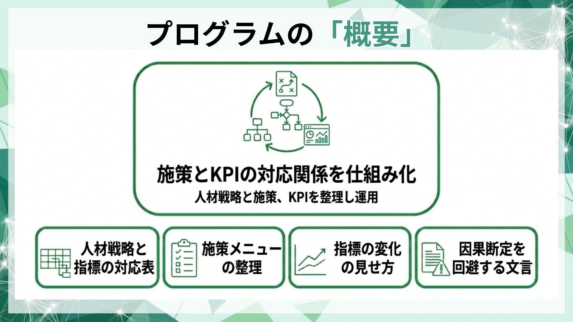 本プログラムは、施策とKPIの対応関係をロジックモデル(対応表)として整理し、施策実行と指標推移を一体管理することで、継続的な説明可能性を担保します。