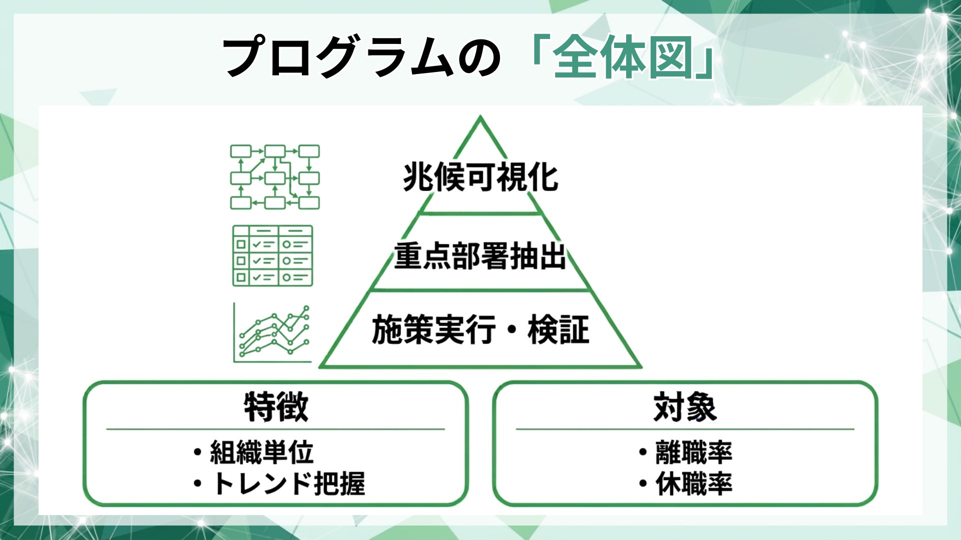 本プログラムは、人材戦略と施策、人的資本KPIの対応関係を整理し、運用として回すためのDX支援です。