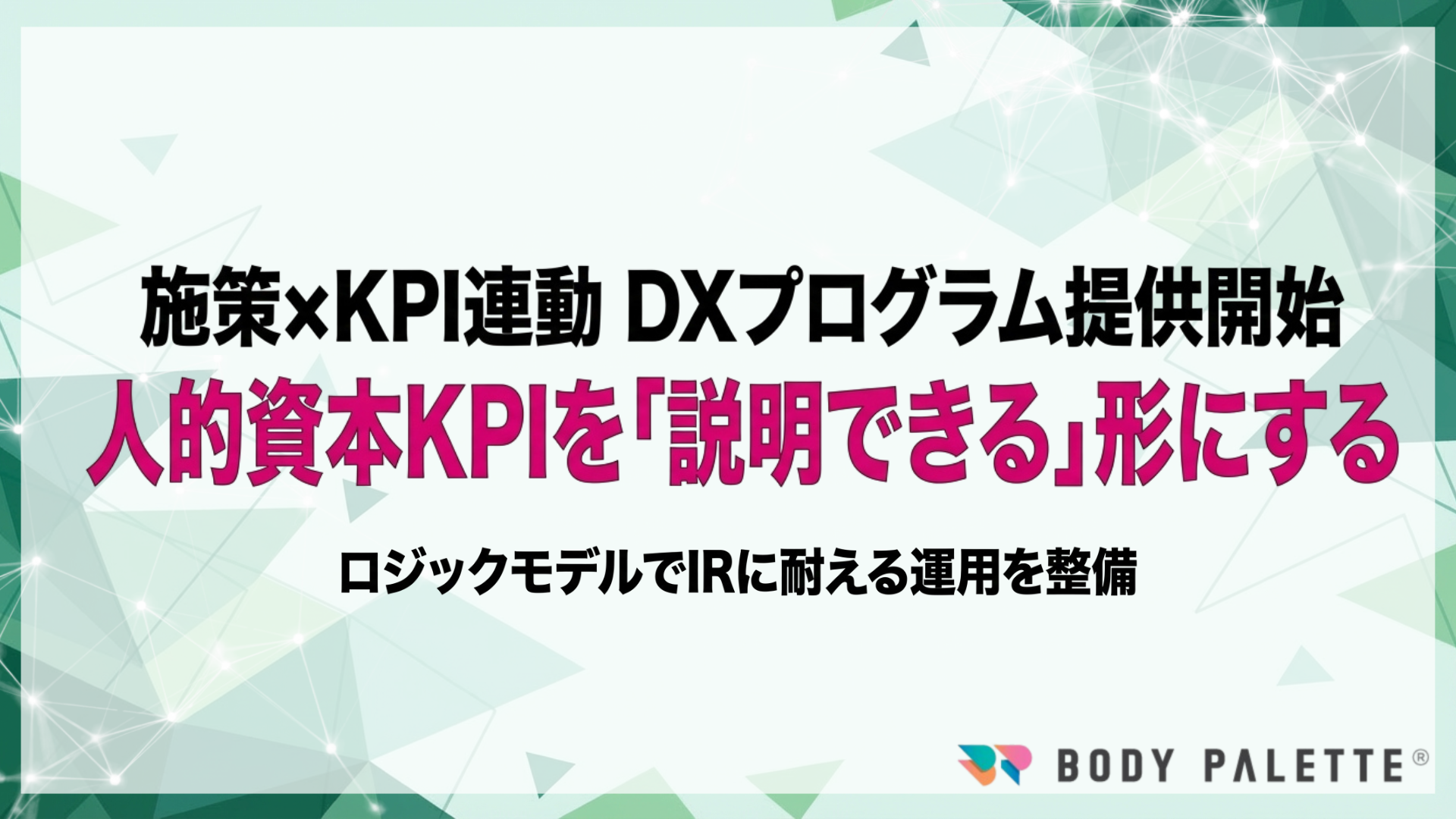 本プログラムは、人材施策と人的資本KPIをロジックモデルで紐づけ、施策実行と指標推移を一体管理し、投資家に説明できる形で運用するDX支援です。