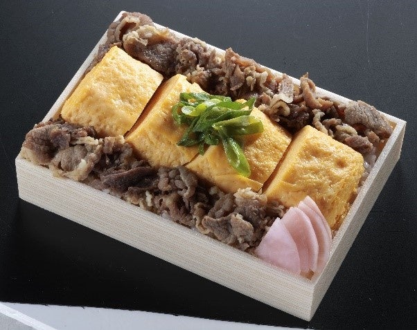 国産牛をすき焼風のたれで甘辛く煮付け、お重にいたしました。