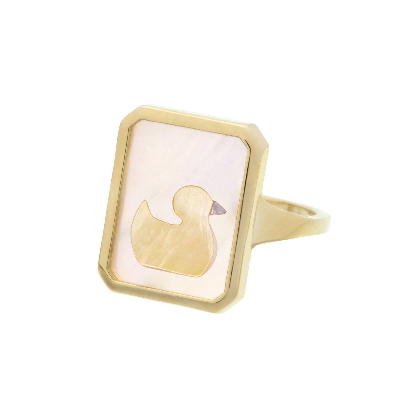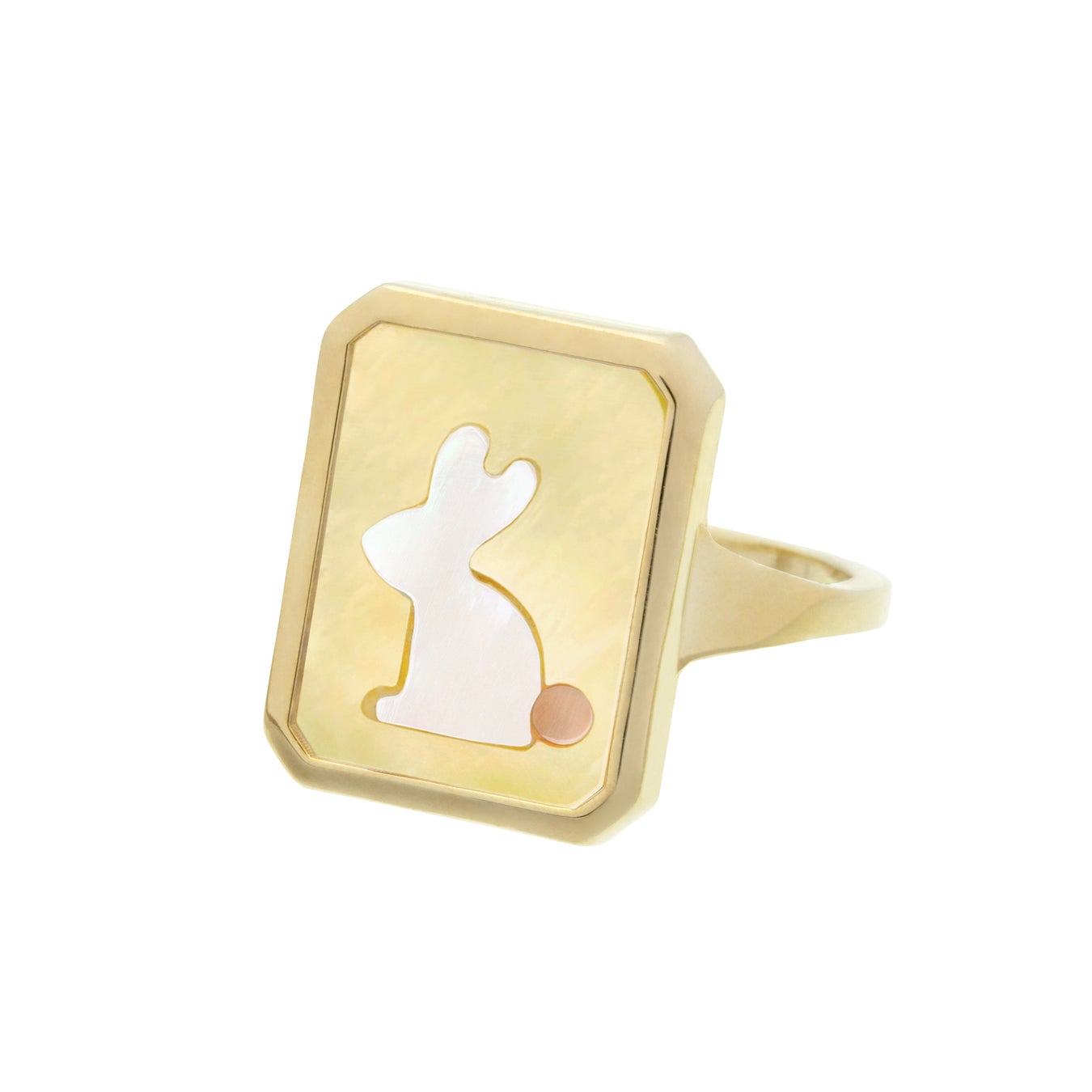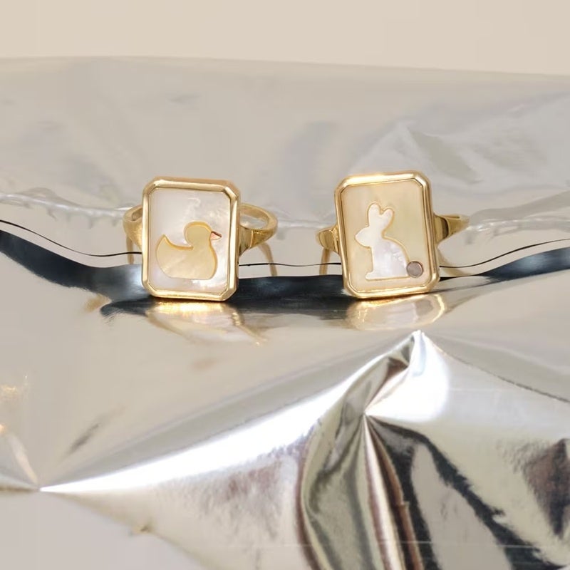 ゆったりとした時間の過ごし方を知っているアヒル、そしていつでも遊びの準備ができているウサギのモチーフが、ゴールドとマザーパールによって小さな宝物へと変わります。リングとネックレスで展開され、洗練されたデザインと優しい輝きが魅力です。