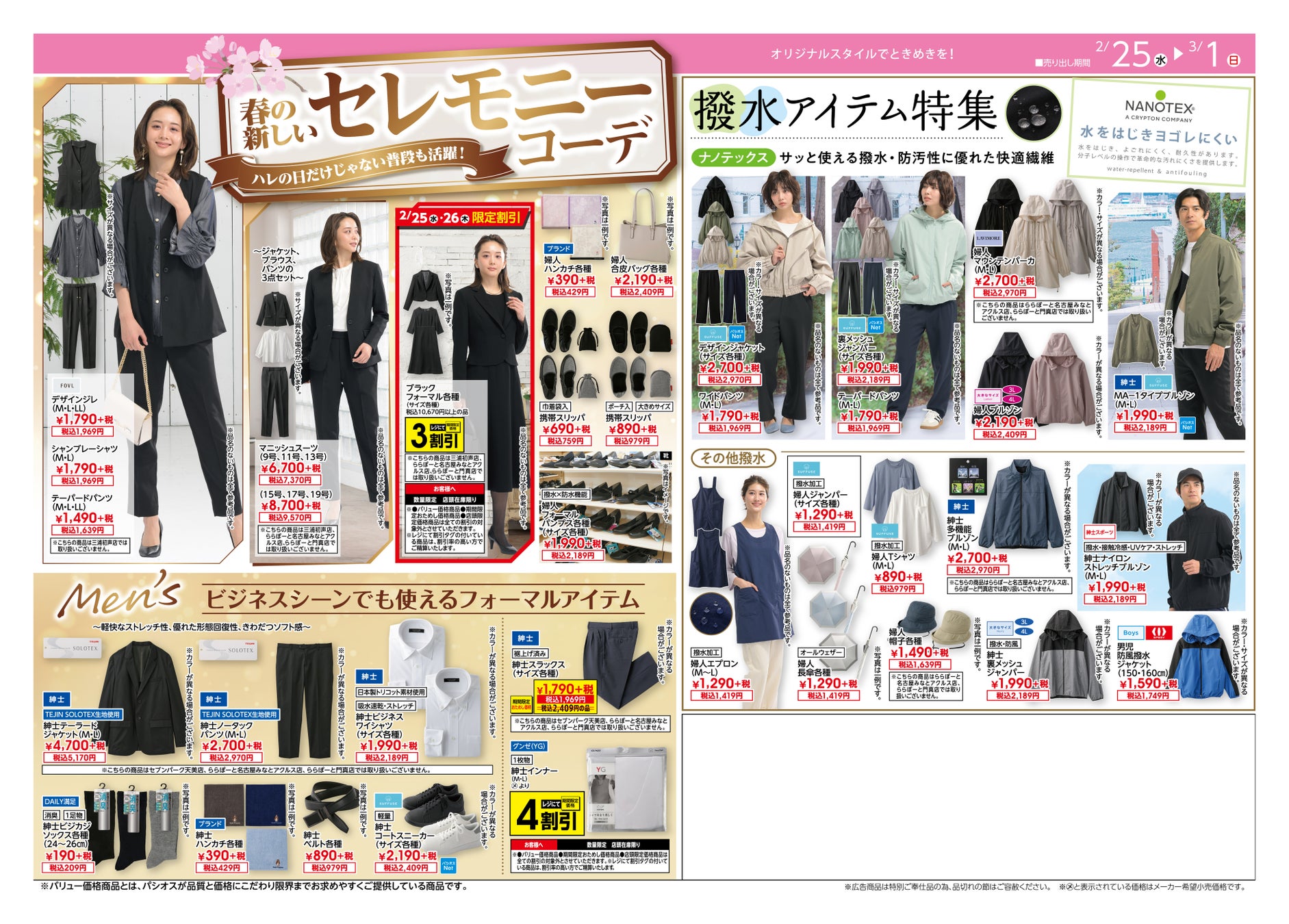 チラシ裏面では、セレモニーコーデの紹介や、撥水アイテム特集を開催いたします。