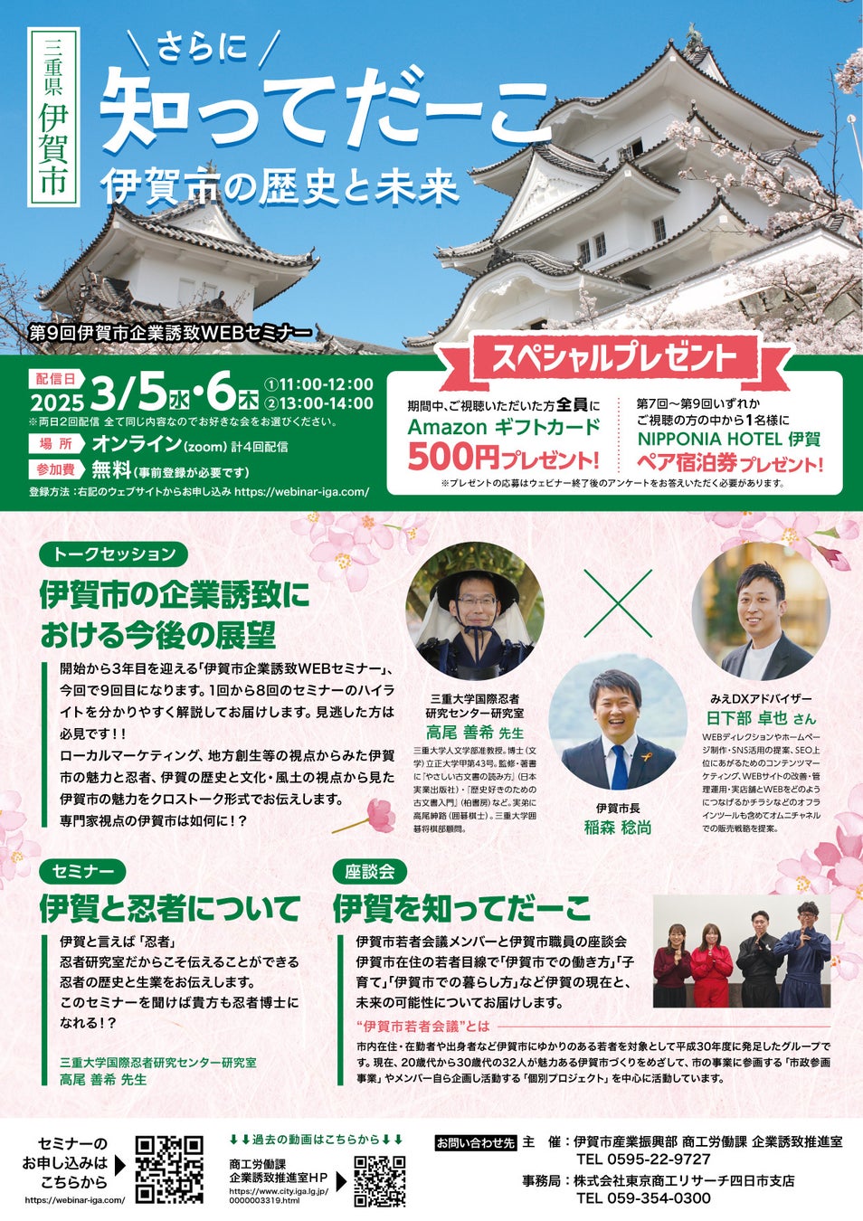 トークセッションでは、これまで開催された企業誘致WEBセミナーを振り返りながら、みえDXアドバイザーの日下部卓也さん、高尾准教授と伊賀市長を交えクロストーク形式により伊賀市の文化や地方創生、伊賀市の企業活動に有利な情報をお伝えします。