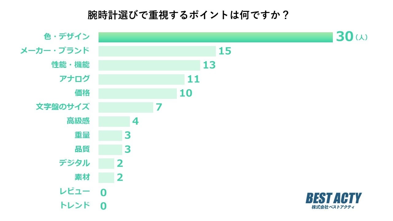 腕時計選びで重視するポイントについて100人にアンケートを行ったところ、「色・デザイン」と回答する人が最も多い結果となりました。