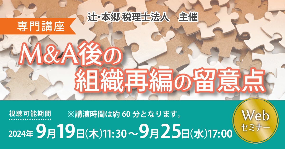 辻・本郷 税理士法人(本社:東京都新宿区、理事長:徳田孝司)は、2024年9月19日(木)より【専門講座】M&A後の組織再編の留意点」セミナーを開催いたします。本セミナーでは、合併と分割を利用した組織再編の手法を選ぶ際に、留意する点について解説します。無対価合併と株対価合併の選定方法、新設分割と吸収分割の選定方法、組織再編税制についても触れます。