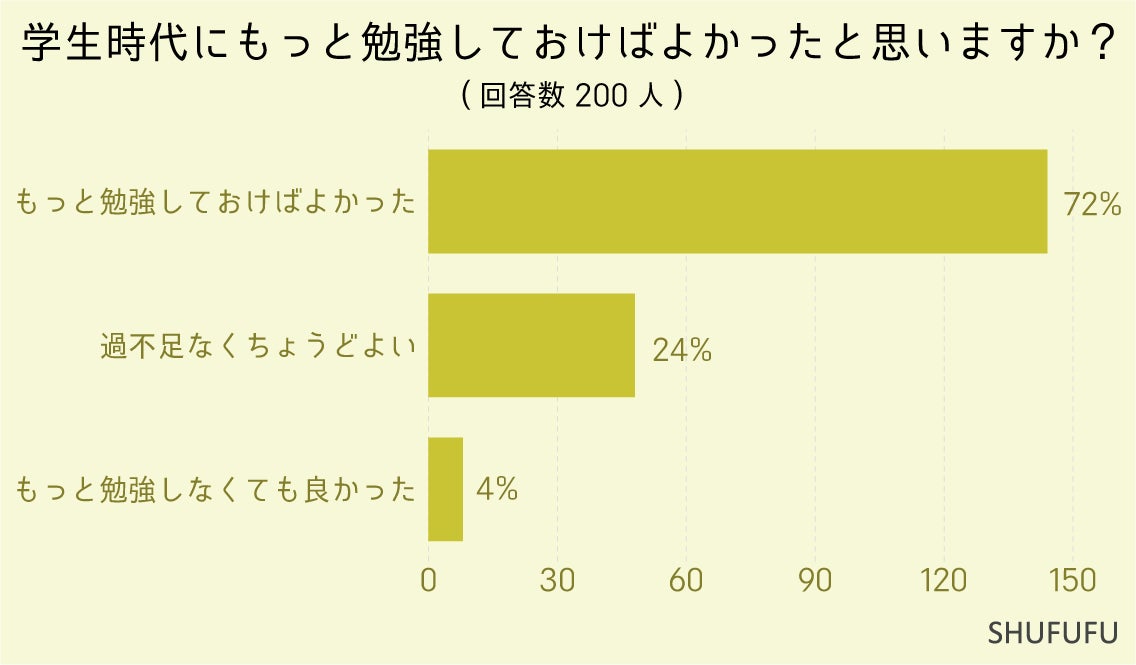 学生時代にもっと勉強しておけばよかったと思いますか?の問いに対して最も多かったのが「もっと勉強しておけばよかった(72%)」でした。 次いで「過不足なくちょうどよい(24%)」「もっと勉強しなくても良かった(4%)」という結果でした。もっと勉強しておけばよかったと後悔している方がかなり多い結果になりました。学生時代はそこまで勉強しなくてもよいと思っている人は少数派のようです。