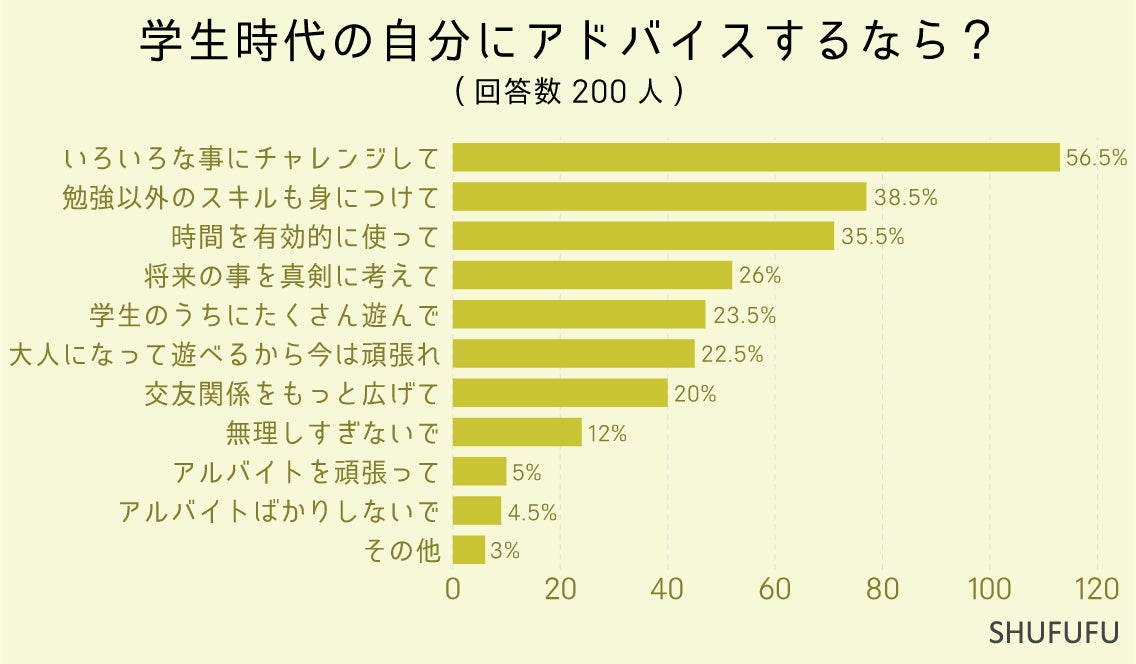 学生時代の自分にしたいアドバイスでは「いろいろな事にチャレンジして」が最多でした。若いうちに色々経験していると将来の選択肢が広がりますね。