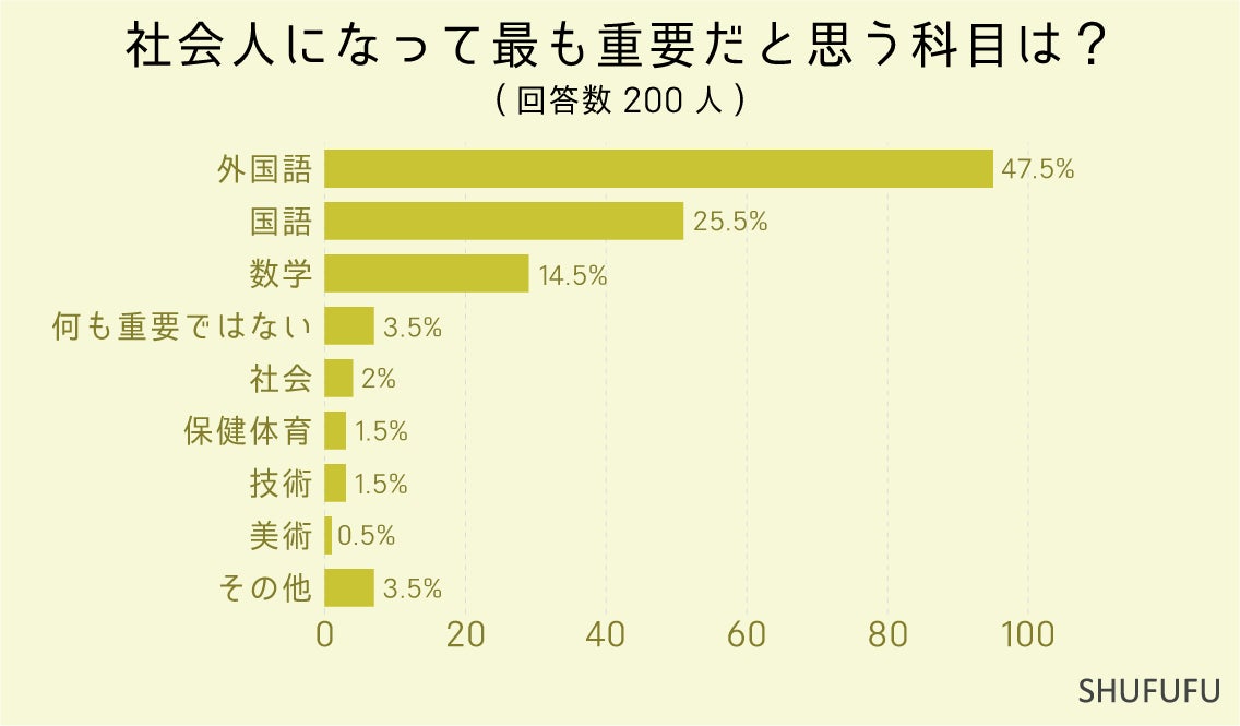 社会人になって最も重要だと思う科目に関しては1位「外国語(47.5%)」、2位「国語(25.5%)」でした。1位・2位ともに言語にまつわる教科になりました。コミュニケーションの必要性が高まっているようですね。