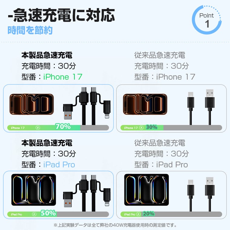 ※上記実験データはすべて自社40W充電器使用時の測定値です。使用環境や機種により異なる場合があります。
