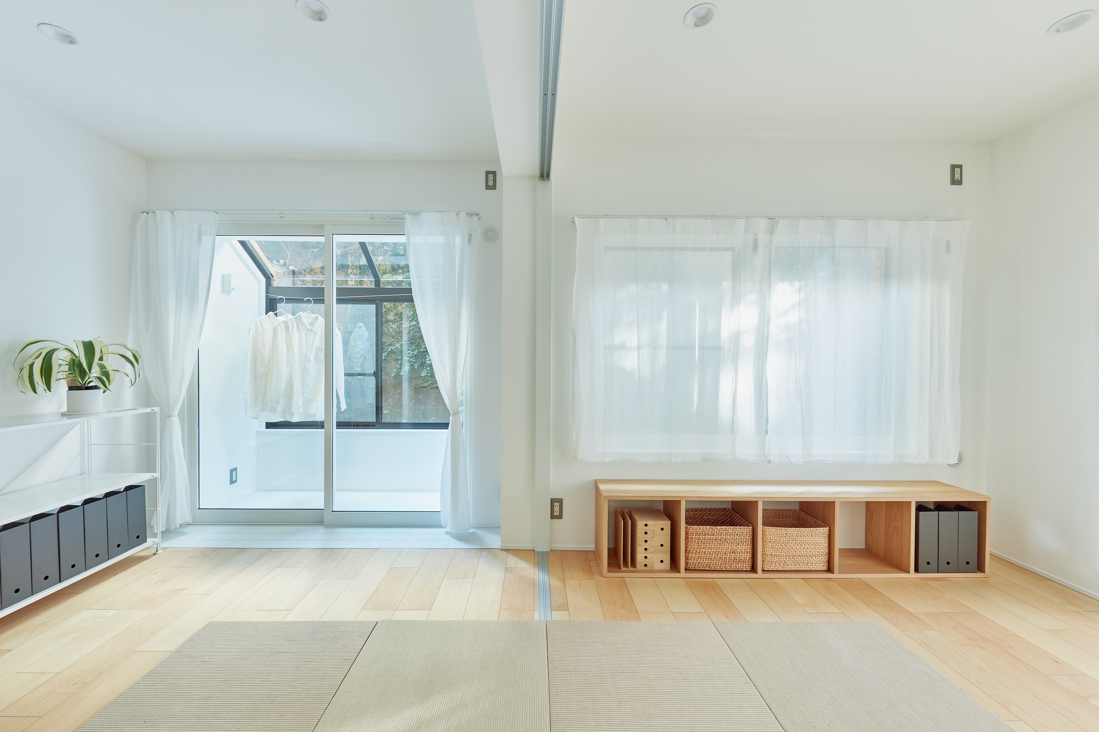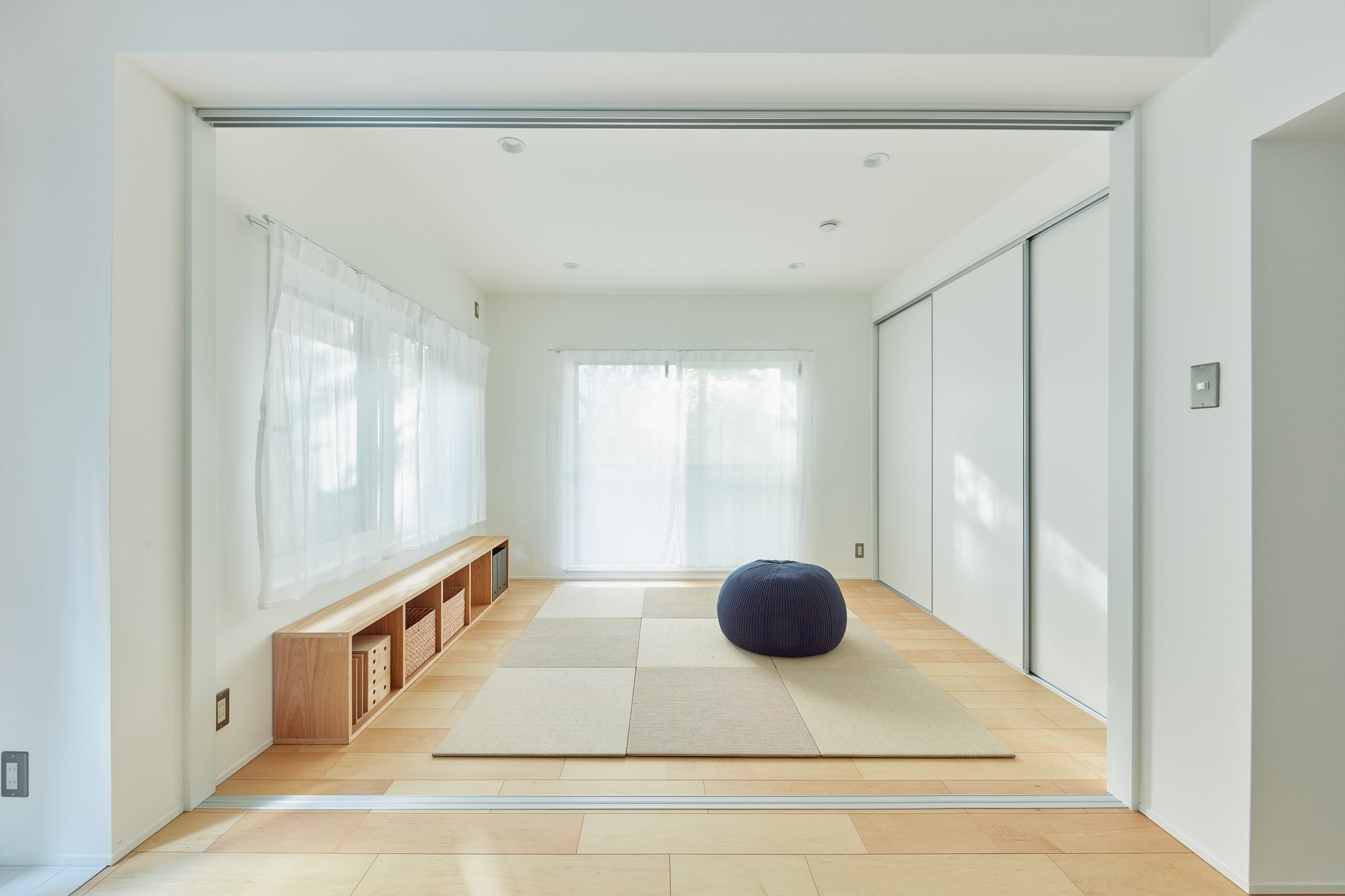 取外しが容易な「ダンボールふすま」と、可動式の「麻畳」を用意することで、使い方を変えられる空間をつくることができます。畳や押入を設けて日中ゴロンとくつろぐ居間を確保できます。
