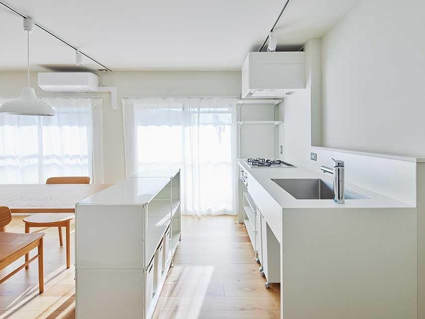全住戸性能向上リノベーション「MUJI INFILL 0」を導入しています。温熱計算をして温熱環境を確保した、明るく風通しの良い空間となっております。また本プロジェクトの要素のひとつである、既存の間取りを変えなくても広く、効率的に、気持ちよく使えるための建具や、スペースを有効活用した収納を取り入れ再生しました。