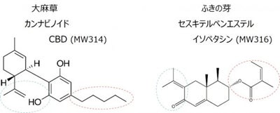春一番に雪の中から顔出すふきの芽(フキノトウ)は外敵から身を守るために苦み成分を蓄えています。「春の皿には苦みを盛れ」といわれるように、日本人は苦み成分の健康の秘訣を伝えてきました。その苦み成分がセスキテルペン類で、イソペタシン系やフキノリド系、フキノン系といったフキ特有のテルペン類が豊富に含まれています。ふきテルペンの主成分であるイソペタシンは、CBDと分子量がほぼ同じで、構造も類似しています(下図)。