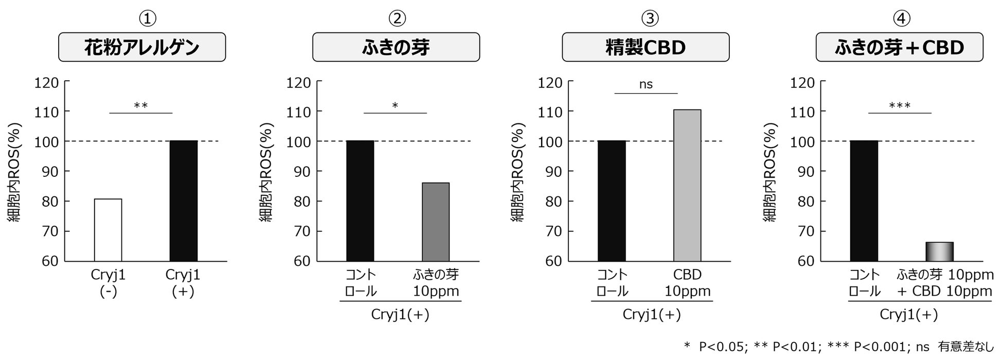 このCryj1刺激条件下において、ふきの芽フィトカンナビノイドは炎症を有意に抑制することが分かりました(結果②)。一方、精製CBD(純度99%)には炎症抑制効果は見られませんでした(結果③)。しかし精製CBDとふきの芽フィトカンナビノイドを一緒に添加したところ、驚くべきことに、ふきの芽フィトカンナビノイド単体よりも有意に高い炎症抑制効果を発揮することが明らかとなりました(結果④)。