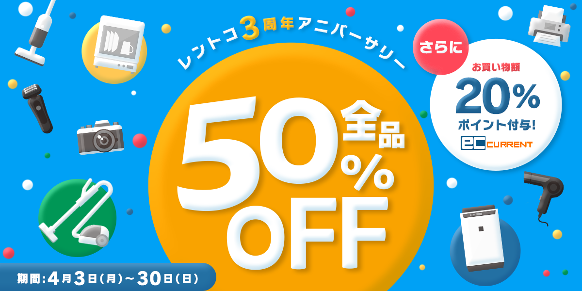 レントコのオープン3周年を記念し通常商品が全品50%OFF!