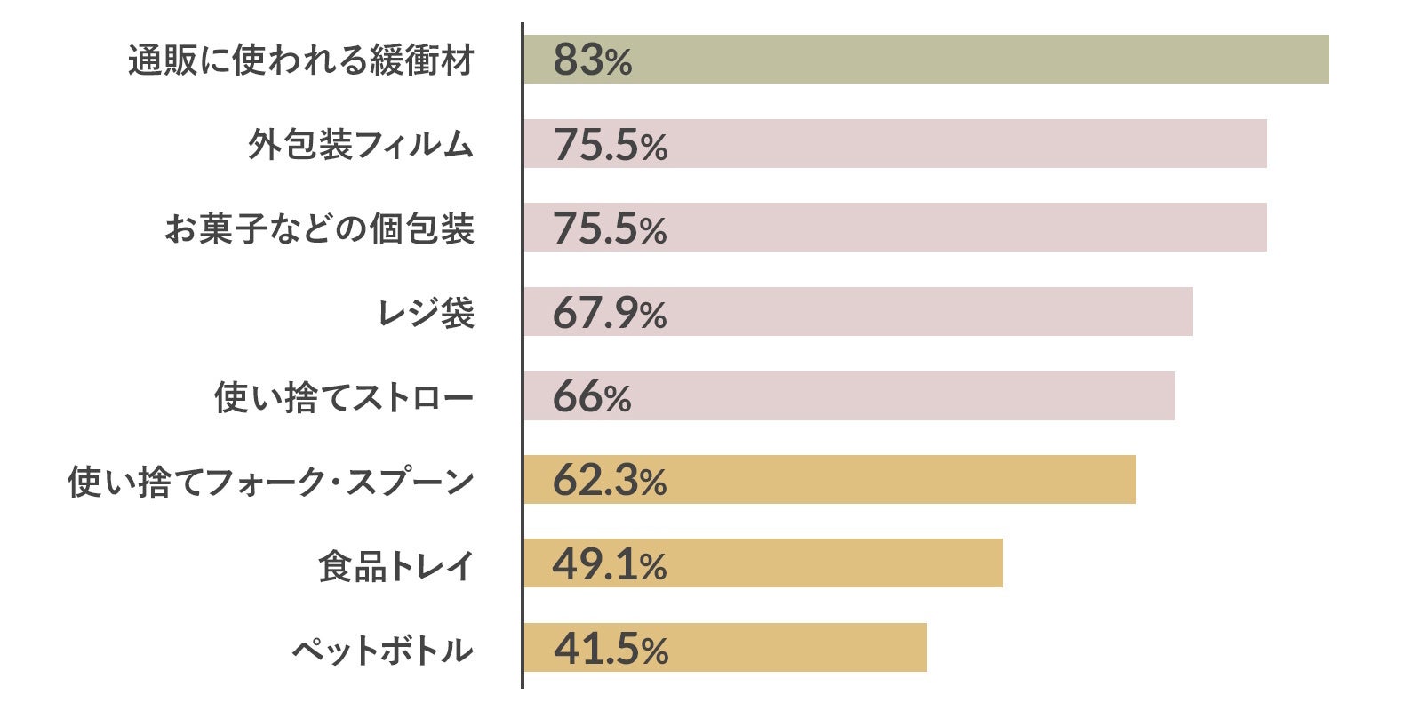 もっとも多かったのは「通販の緩衝材」の83.0%。それに「外包装フィルム(75.5%)」「お菓子などの個包装(75.5%)」が次ぐ結果となりました。この回答結果から、不要だと感じているものが身近なところに数多くあることがうかがえます。