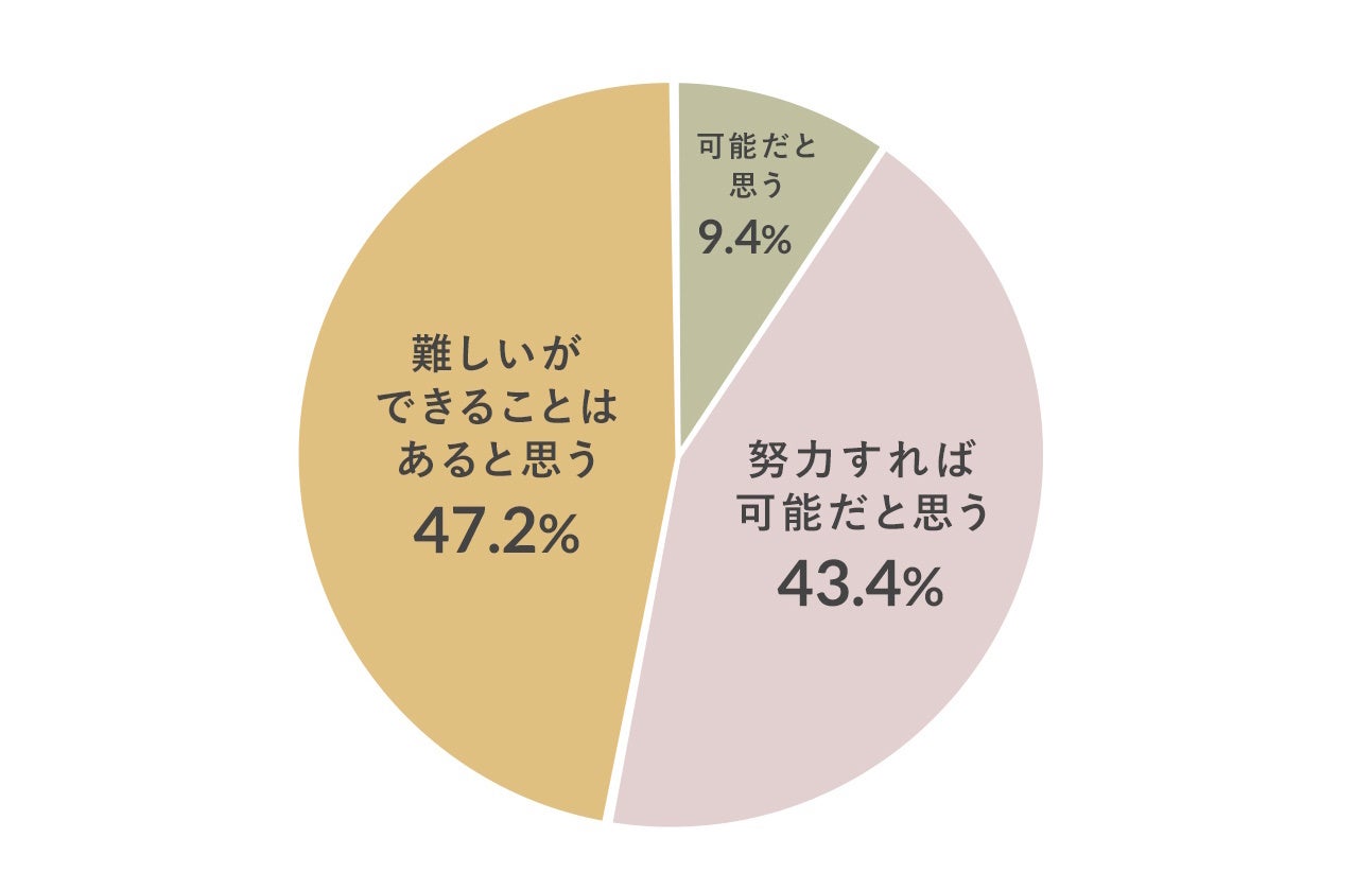 「可能だと思う」は9.4%、「努力すれば可能だと思う」は43.4%、「難しいができることはあると思う」は47.2%でした。「限界がある」「とても難しい」といった否定的な回答はゼロで、私たちの努力は欠かせないですが、「できると思う」「できることはあると思う」と肯定的に捉えている人がほとんどでした。