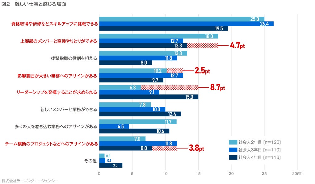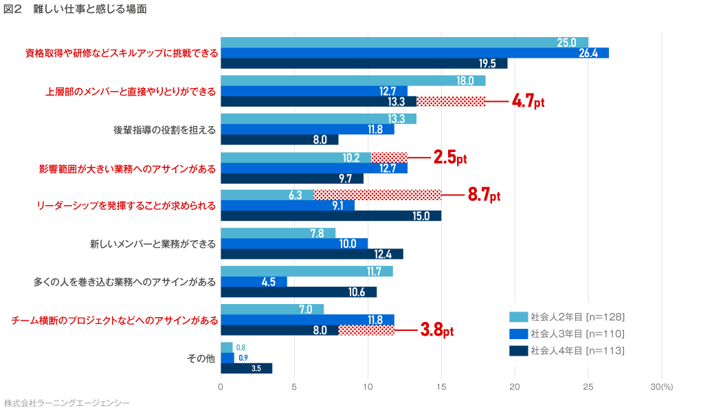まずは、「難しい仕事をすること」とは具体的にどのような場面か、各年次に質問しました。結果、「資格取得や研修などスキルアップに挑戦できる」場面が、各年次最も高い結果となりました(社会人2年目25.0%、社会人3年目26.4%、社会人4年目19.5%)。