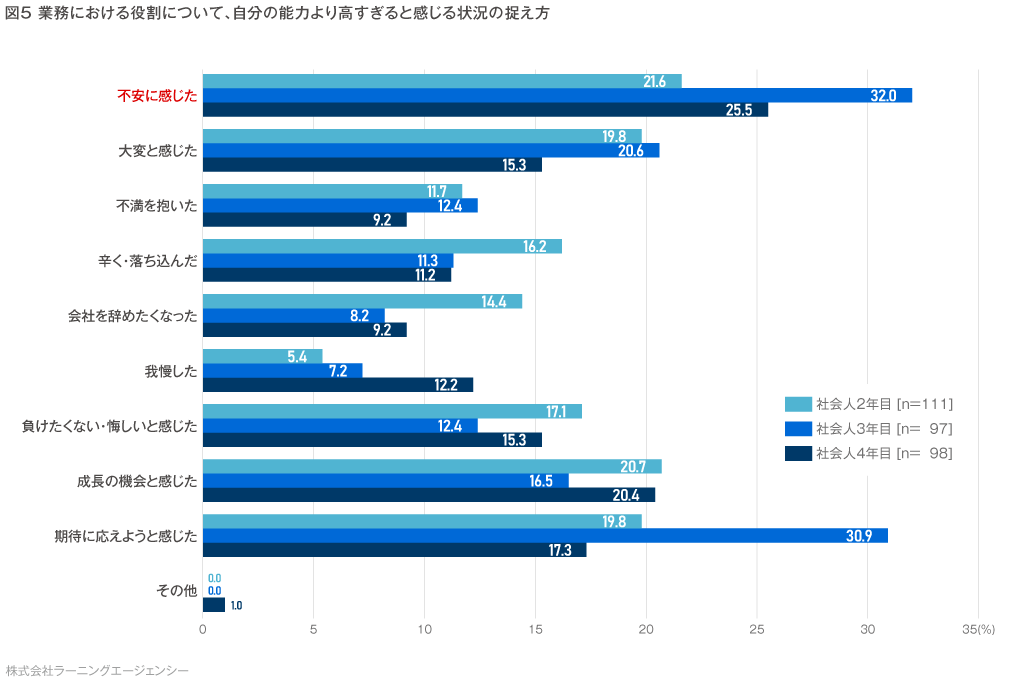 「業務における役割について、自分の能力より高すぎると感じる状況をどのように捉えましたか」と質問したところ、「不安に感じた」と回答した割合が、「成長の機会と感じた」「期待に応えようと感じた」を超え、各年次で最も高い結果(2年目21.6%、3年目32.0%、4年目25.5%)となりました。自分の能力より高すぎる、仕事が難しすぎると、ポジティブな感情よりも不安の感情が勝ることがわかりました。(図5)