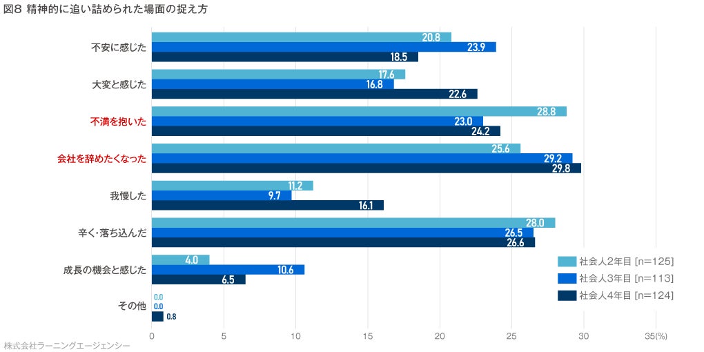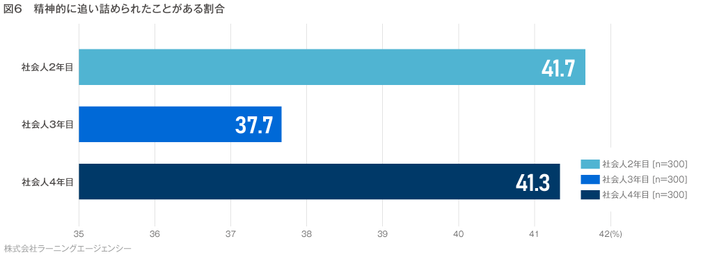 実際、精神的に追い詰められたことがあるかという質問では、社会人2年目の41.7%、3年目は37.7%、4年目は41.3%の人が「精神的に追い詰められたことがある」と回答しています。(図6)