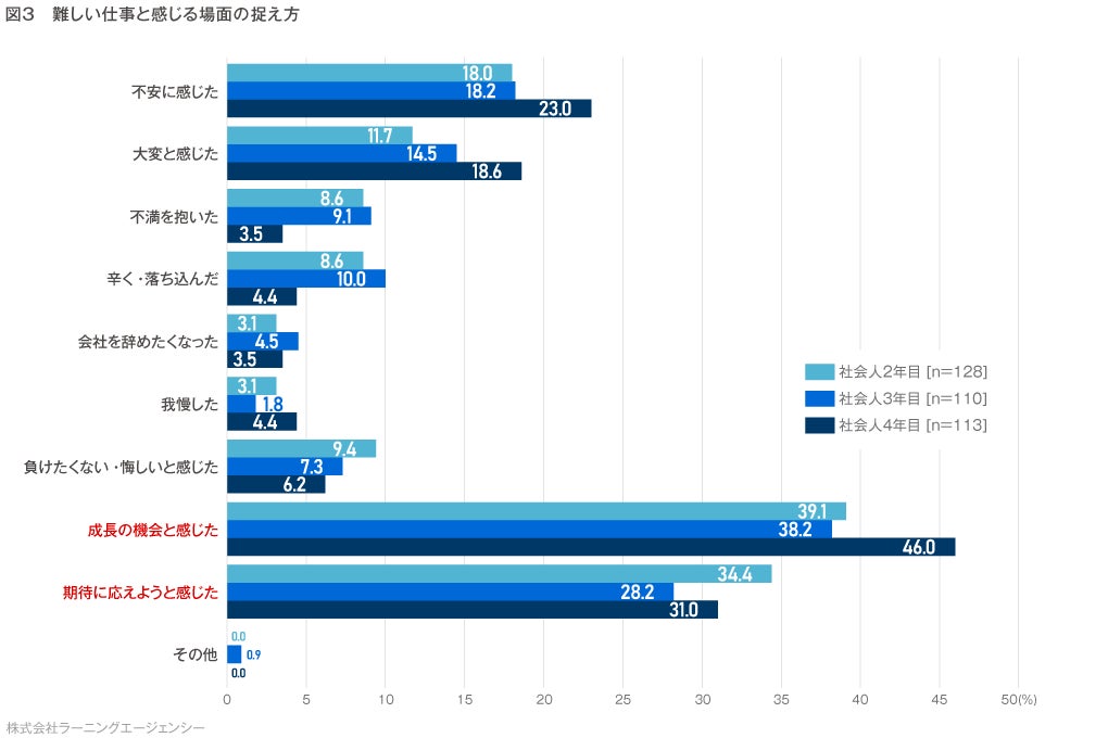 「成長の機会と感じた」が全ての年次で最も高い結果となり、社会人2年目は39.1%、社会人3年目は38.2%、社会人4年目では46.0%となりました。次に「期待に応えようと感じた」が入り、2年目34.4%、3年目28.2%、4年目31.0%と続きました。仕事が難しいと感じる場面では、ポジティブに捉える社員が多いことがわかります。(図3)