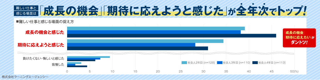 ・難しい仕事と感じる場面は「成長の機会」「期待に応えよう」と全年次がポジティブに捉える