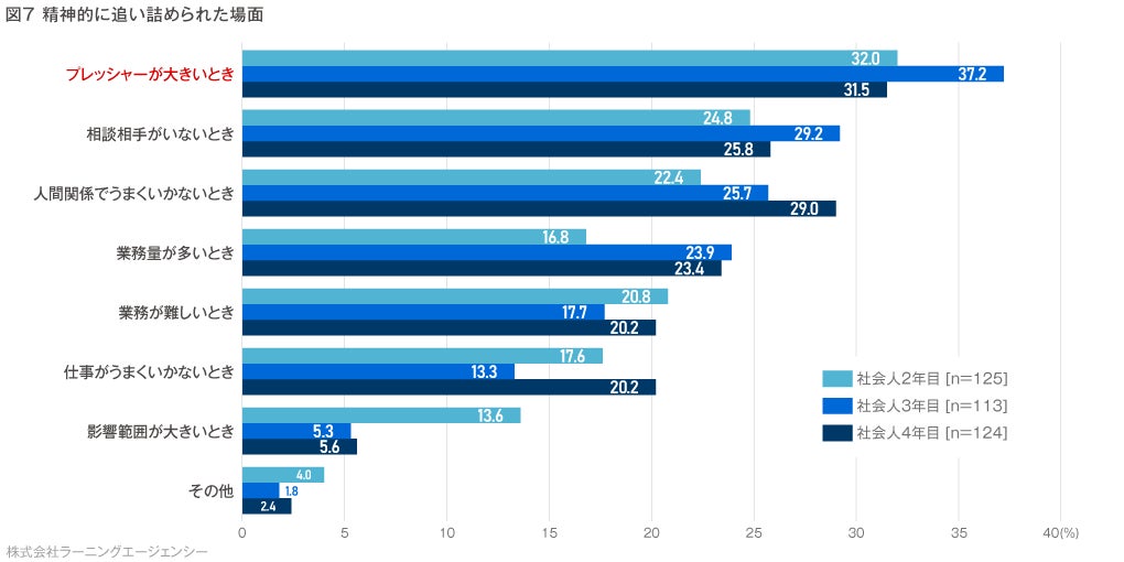 精神的に追い詰められたことがある人に、どのような場面において精神的に追い詰められたか質問をしたところ、年次関わらず「プレッシャーが大きいとき」と回答した割合が最も高くなりました(2年目32.0%、3年目37.2%、44年目31.5%)。(図7)