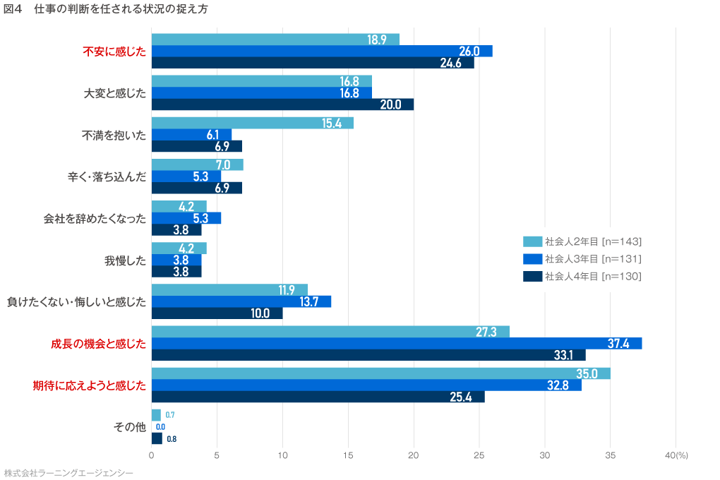 4. 仕事の判断を任される状況、どの年次でも成長の機会や期待に応えようといった気持ちに繋がるが、その次には不安の感情が存在