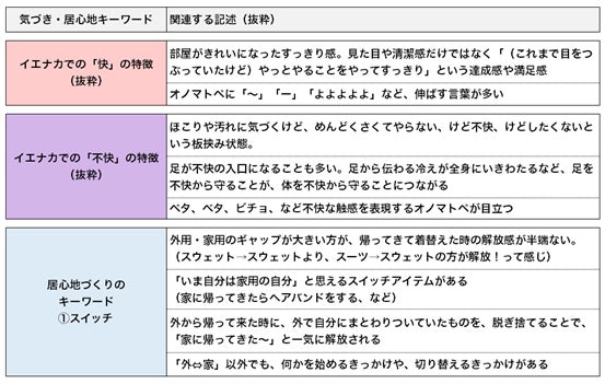 集まった記述から「イエナカ居心地体感データベース」を作成。多角的なデータ分析を通して、イエナカでの居心地における未充足ニーズや課題を発見。