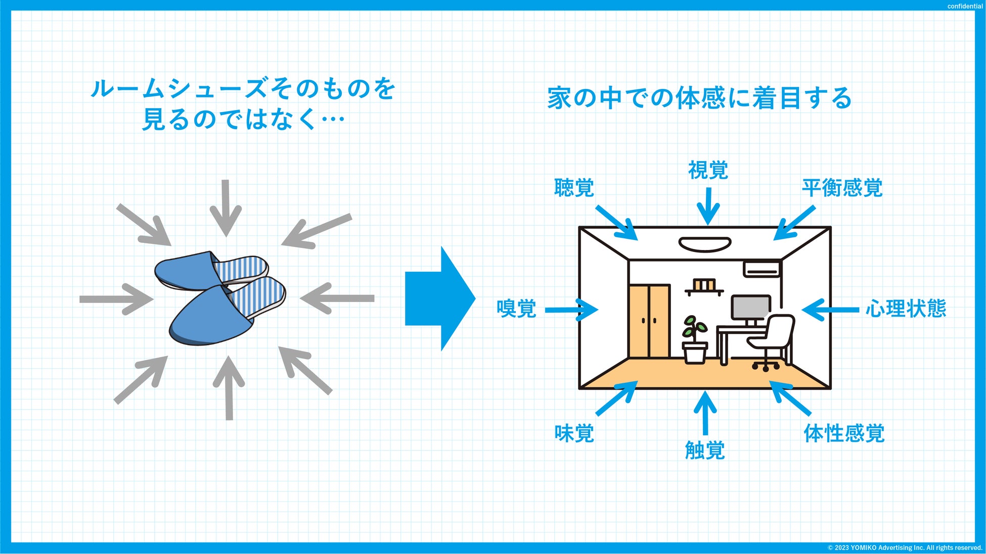 ルームシューズそのものを見るのではなく、「ルームシューズ=家の中での居心地をつくるもの」と捉え、まずは「イエナカの居心地」を深堀するところからスタートしました。
