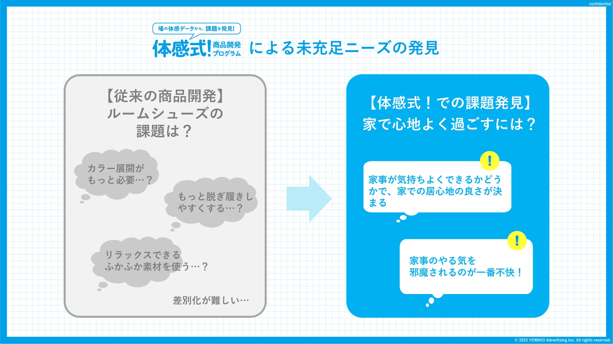 株式会社 読売広告社(本社:東京都港区 代表取締役社長:菊地英之、以下、YOMIKO)は、『体感式!商品開発プログラム™』の提供を開始しました。本プログラムは、コモディティ化によって未充足ニーズの発見が困難な現代において、五感で感じていること(=体感)から未充足ニーズを言語化し、これまでにない新たな商品・サービスの開発を支援するものです。