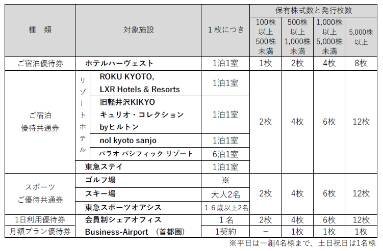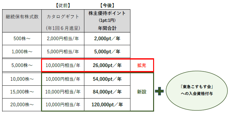 「5,000株~」区分の進呈額を拡充し、「10,000株~」「15,000株~」「20,000株~」の3区分を新設いたします。また、本制度の対象かつ10,000株以上保有されている株主さまには、各種特典・サービスが受けられる「東急こすもす会」入会資格を付与いたします。