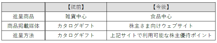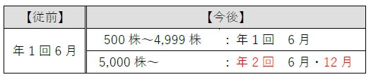 年間通じての商品提供等を目的として5,000株以上保有の株主さまの進呈時期を改定いたします。なお、「株主様ご優待券」は従来どおり、100株以上保有の株主さまに年2回(6月・12月)発行いたします。