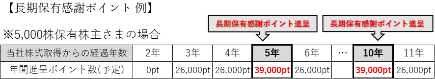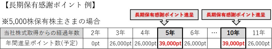 継続保有株主優遇制度の対象株主さまの中でもより長期に当社株式を保有していただいた株主さまに対して、長期保有感謝ポイントとして株式取得年度の3月末を起算点に5年毎にポイントを1.5倍に割り増して進呈いたします。なお、長期保有感謝ポイントの進呈は2024年3月末権利確定分からとします。