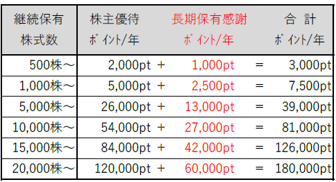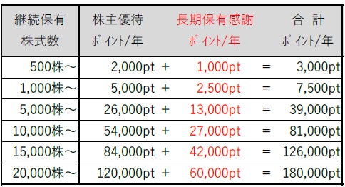 2024年3月末権利確定分(2024年6月末進呈)は経過措置として、継続保有株主優遇制度の対象で、かつ当社株式取得から5年以上経過している株主さまへ、保有年数にかかわらず株主優待ポイントの進呈区分に応じた長期保有感謝ポイントを進呈いたします。