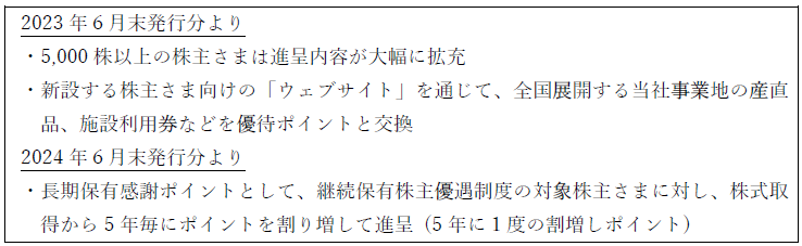 この度、2022年6月に実施しました株主さまアンケートの結果等をふまえ、当社株式への投資の魅力をより一層高め、中長期的に当社をご支援いただく株主さまの増加を図ること等を目的として、「継続保有株主優遇制度」を2023年6月下旬発行分(2023年3月末権利確定分)より拡充いたします。