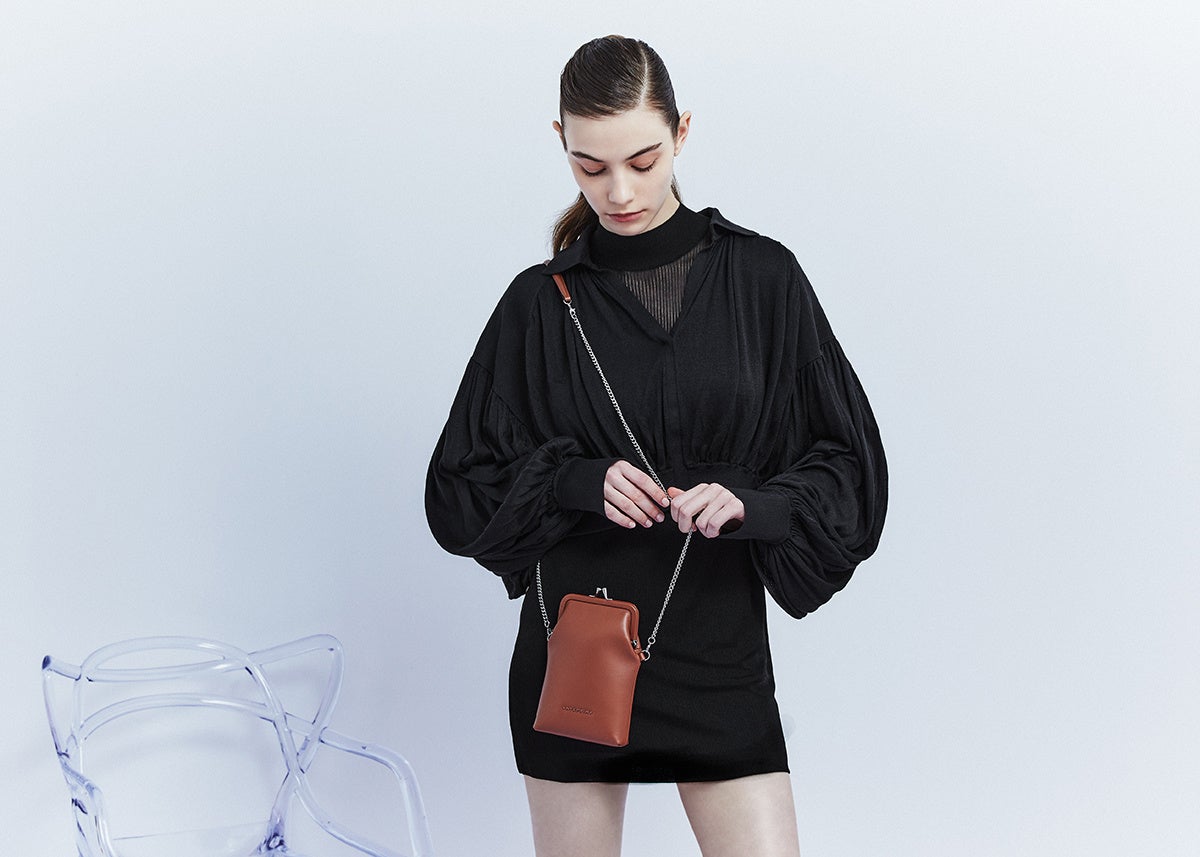 ちょっとした小物やカードを収納できるスモールと、スマートフォンも収納できる縦長シルエットの2型展開です。付属のチェーンは取り外しが可能で、レザーストラップのみにしてハンドバッグとしてもお使いいただけます。