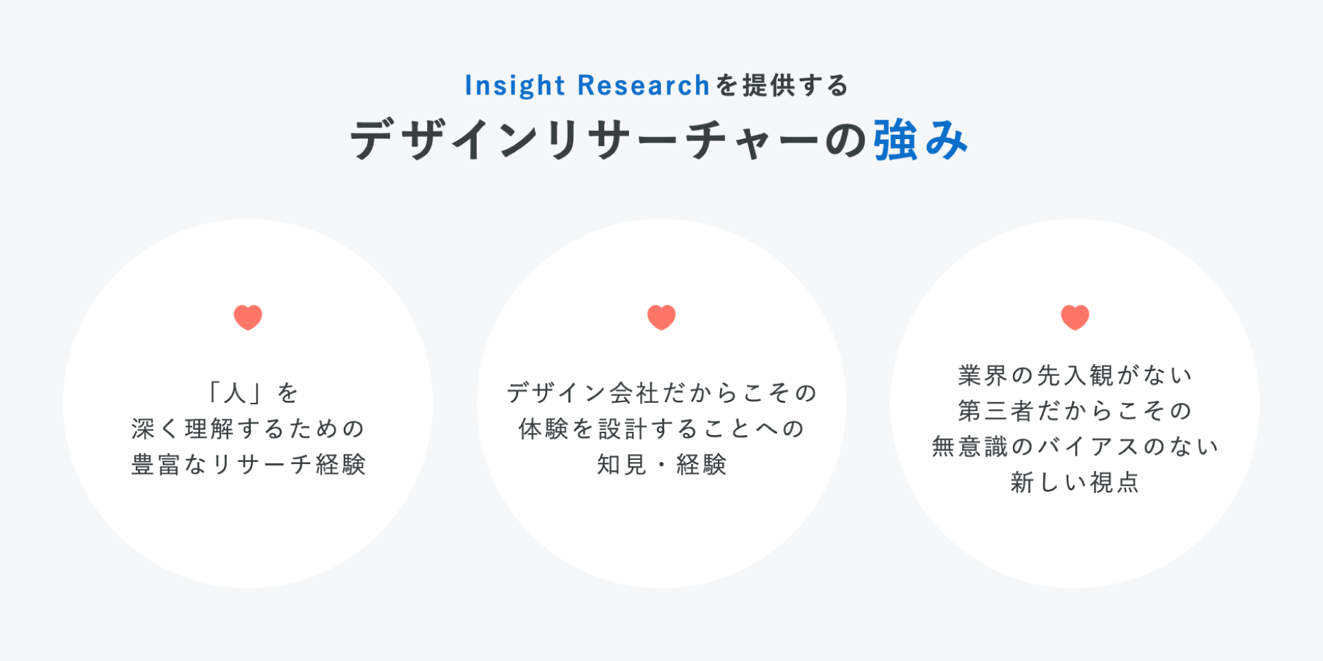 Insight Researchでは、デザインリサーチャーの「人」を深く理解することへの豊富な経験、デザイン会社としての体験設計への知見・経験、さらに先入観のない第三者だからこその客観的かつ新しい視点で、「意味のあるアクション」につながる質の高いリサーチが可能です。
